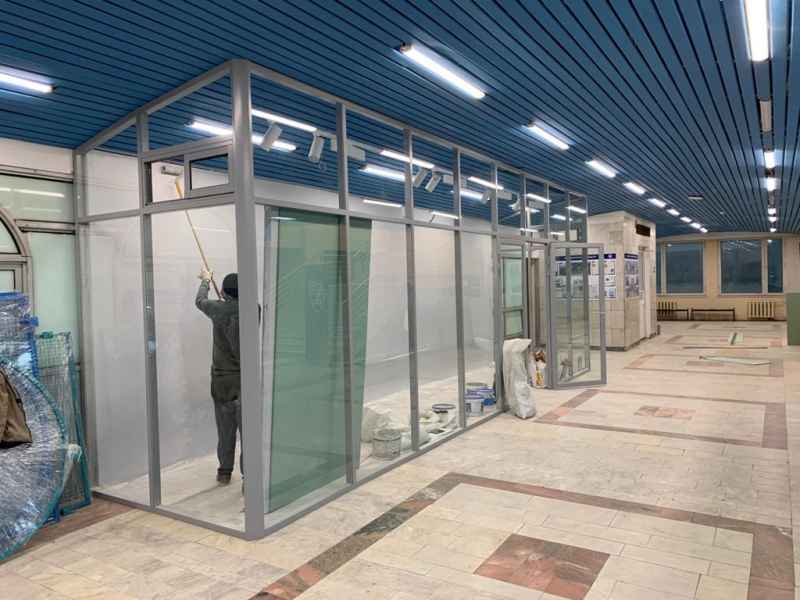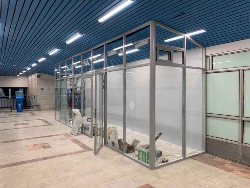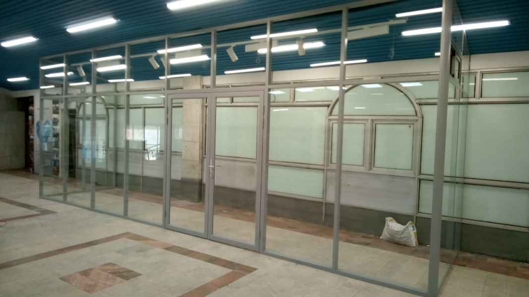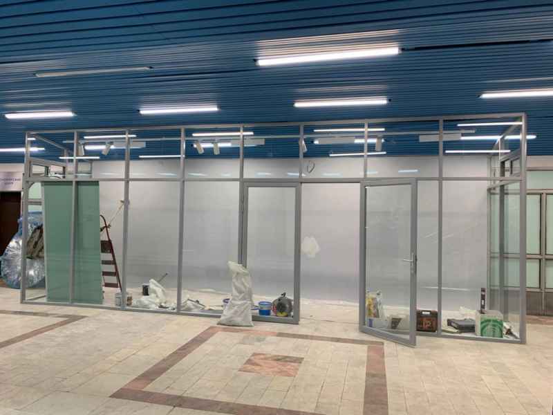Профиль перегородок серого цвета RAL9006, в качестве заполнения использовалось стекло безопасное закаленное толщиной 6мм.