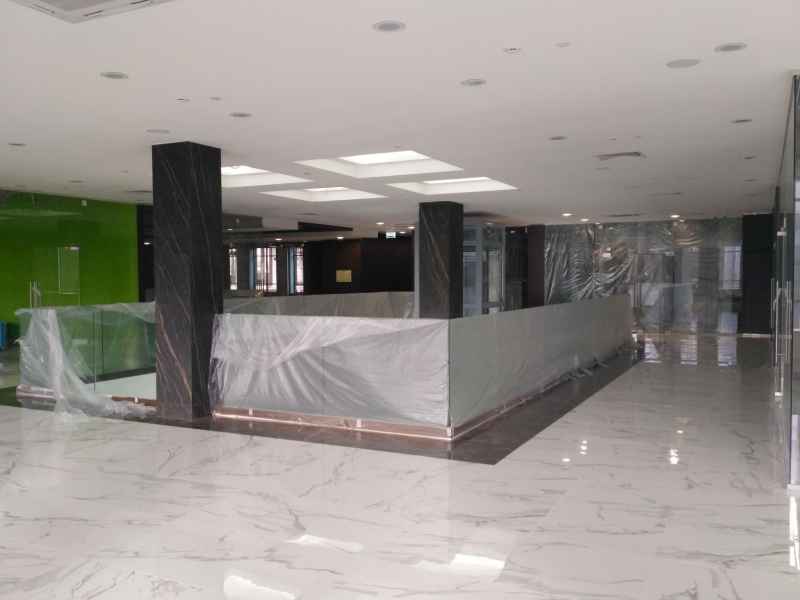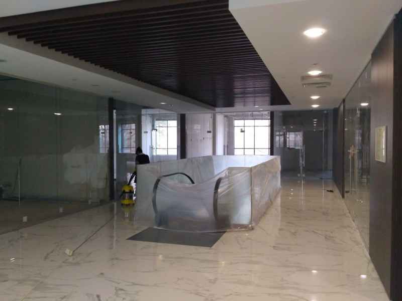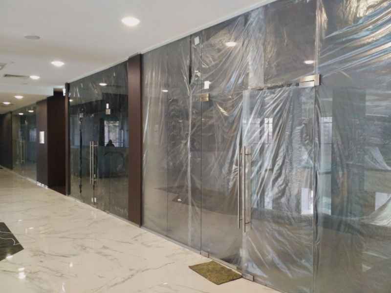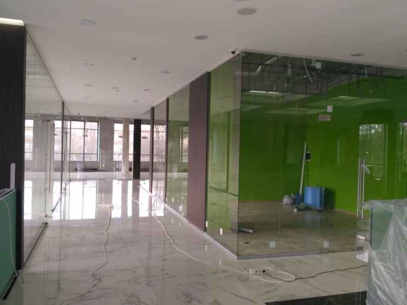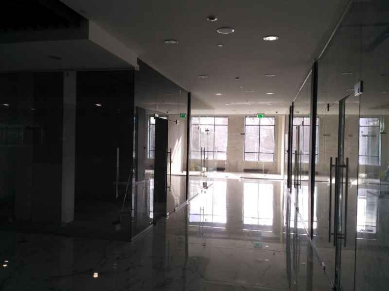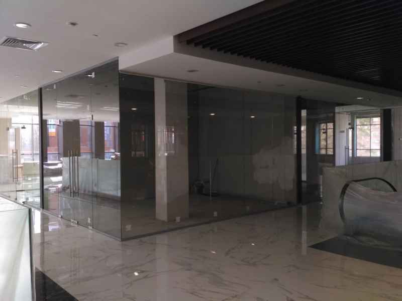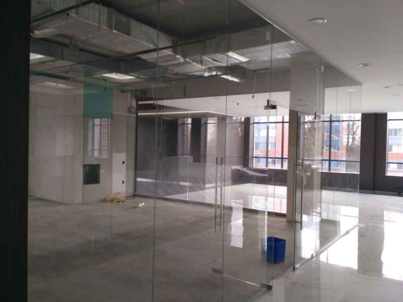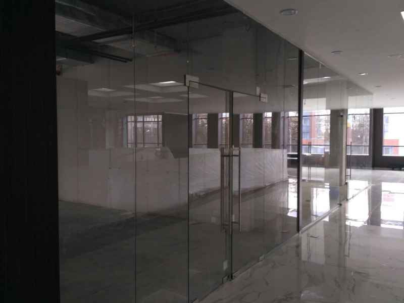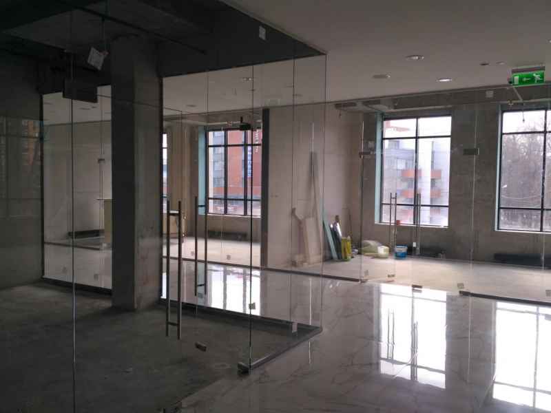 На данном объекте было установлено более 200м2 цельностеклянных перегородок GLASS из безопасного закаленного стекла, толщиной 10мм. Установлены дверные полотна на маятниковой фурнитуре.